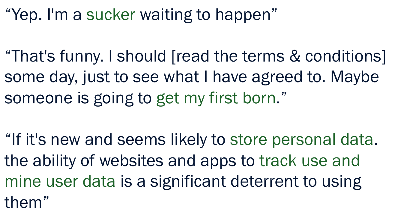 Perhaps the most striking result is the low frequency with which respondents read the Terms and Conditions (in retrospect, though, I should have asked about Privacy Policies as well/instead). Here are some accompanying comments from the survey: