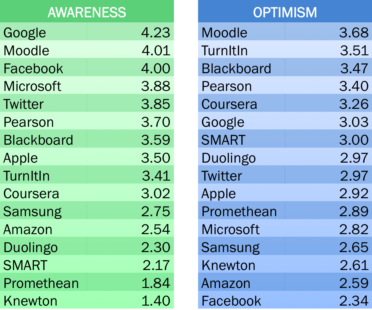 On the whole, the education companies (Moodle, Pearson, Blackboard, TurnItIn, Coursera, Duolingo, SMART, Promethean and Knewton) rated relatively low on the ‘awareness’ scale, but relatively high on the ‘optimism’ scale, although there was a fair amount of ambivalence expressed overall. It could be argued that this combination of low awareness with slightly higher optimism provides some support my hypothesis that ELT educators tend to be overly optimistic.