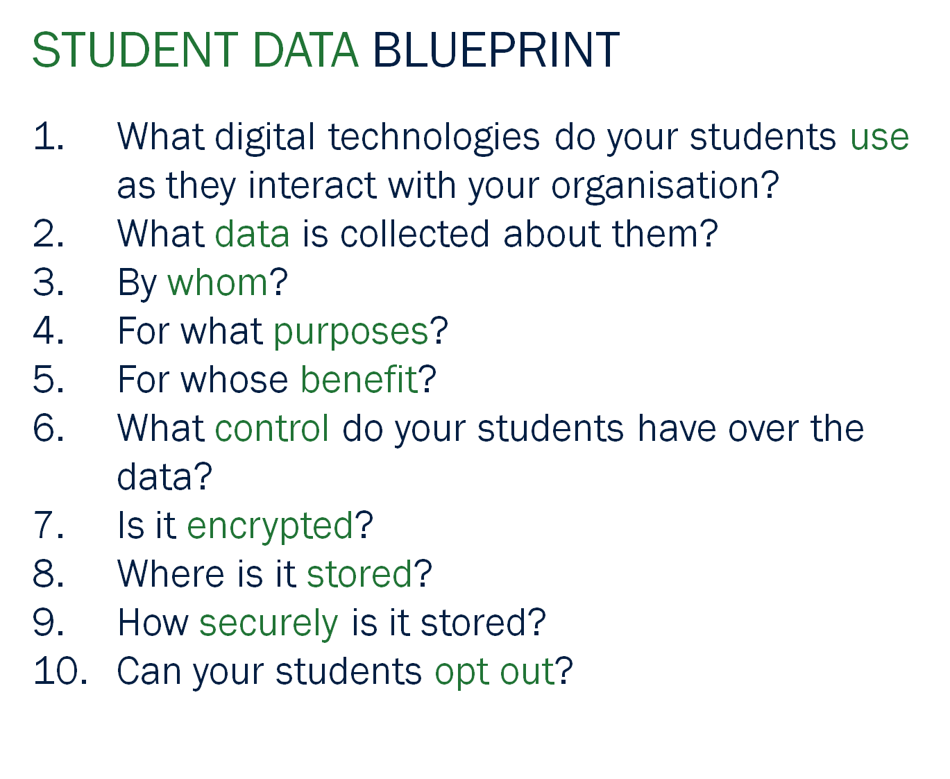 This is a useful concept to apply to the accumulation, storage, transfer, analysis and use (paraphrasing Harvey 2005) of student data as, increasingly, these ‘various interactions and actions’ are mediated by internet-enabled technologies. Hence, the ‘student data blueprint’.