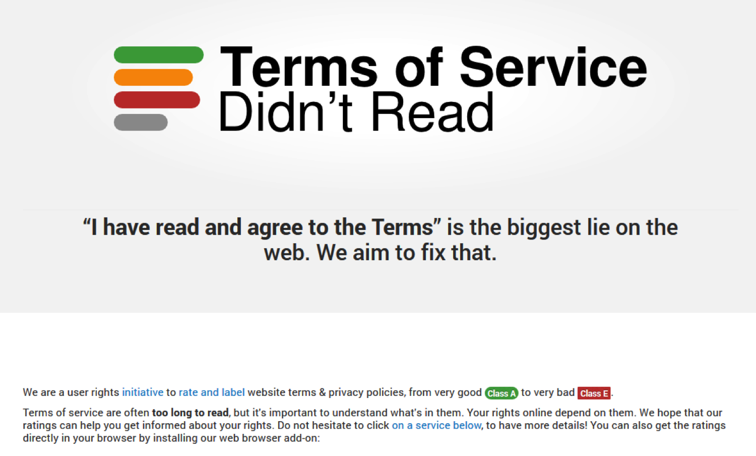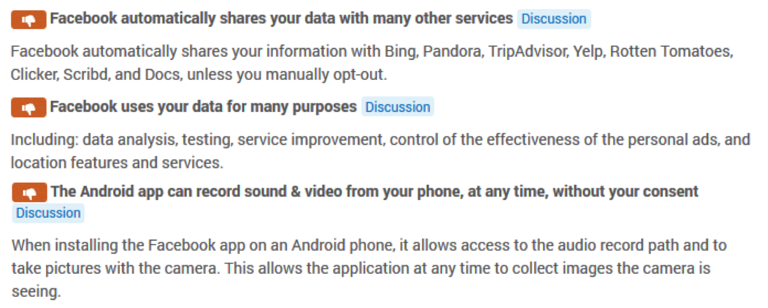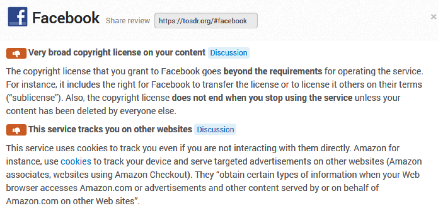You can install it as an unobtrusive web browser extension and then use it to help understand the Terms of Service of various websites you visit, including Facebook. For example, it makes clear the following points about our relationship with Facebook: