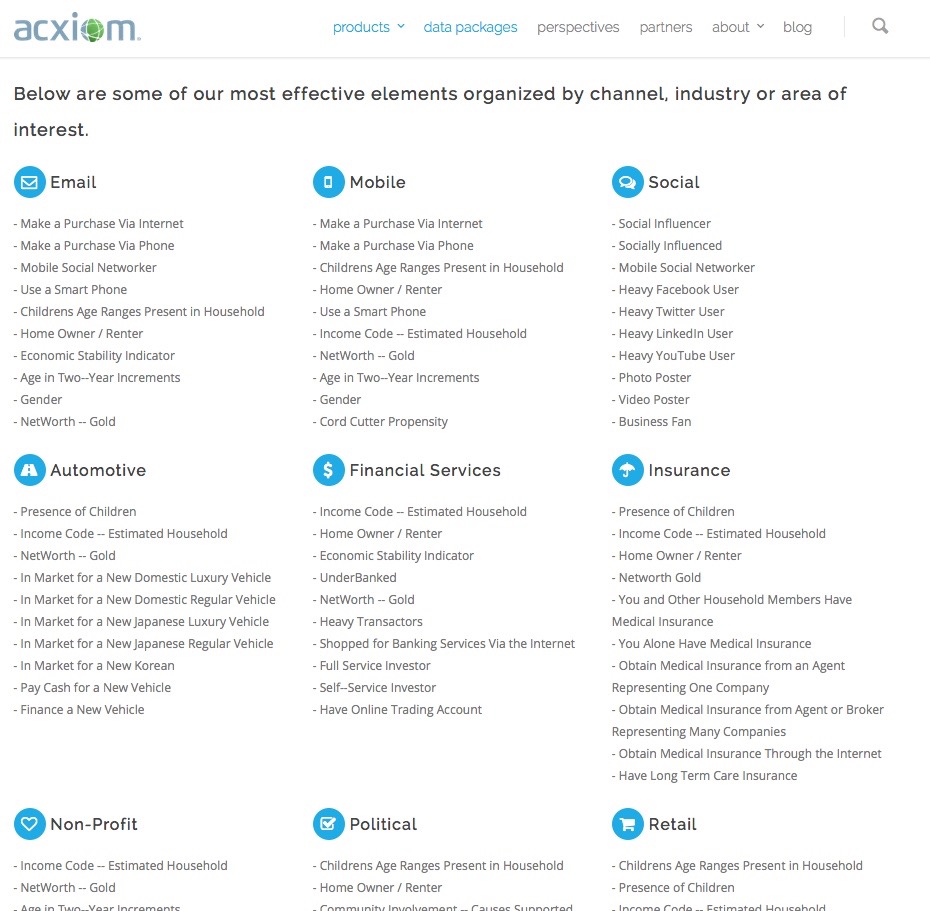 There are many of these data brokers around but one of the oldest and biggest is Acxiom. According to Natasha Singer (2012), Acxiom has “information about 500 million active consumers worldwide, with about 1,500 data points per person.” They use all this data to create a profile of you and sell it as part of ‘data packages’.