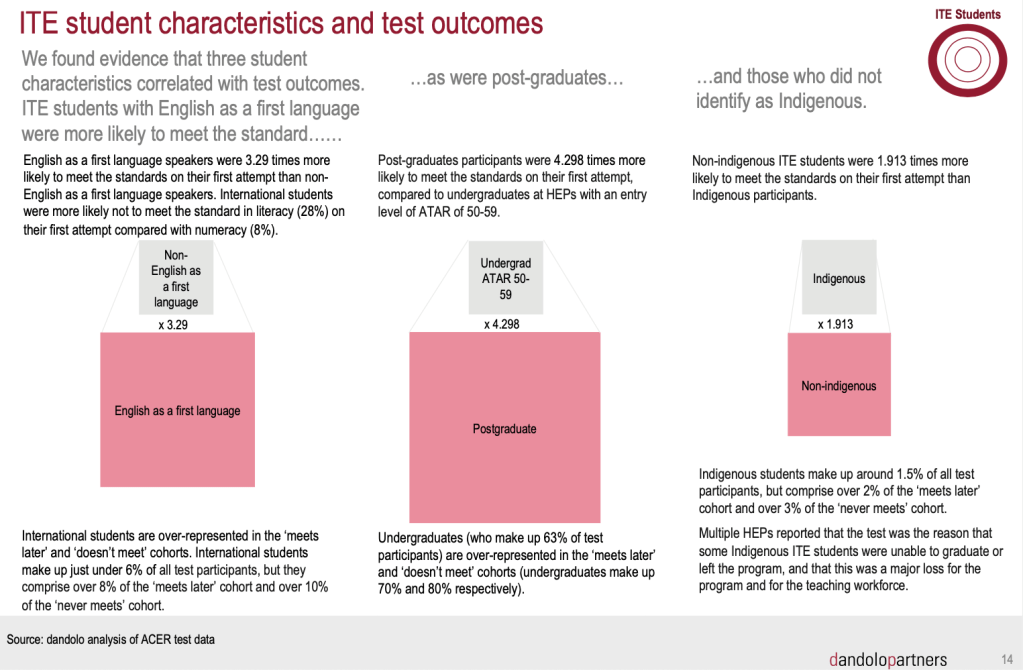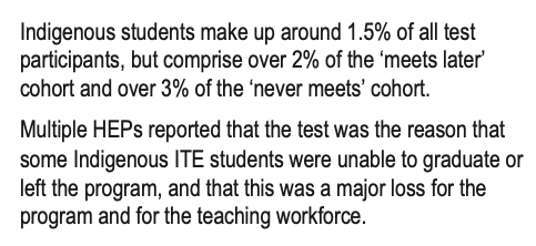 I find this truly alarming, saddening and appalling. It indicates that Indigenous students are overrepresented amongst the students who fail LANTITE, on their first attempt (“the ‘meets later’ cohort”) or on any of their subsequent attempts (“the ‘never meets’ cohort”). It undermines ACER’s claim that LANTITE test questions “are carefully scrutinised in an ongoing attempt to minimise gender, ethnic or religious bias, and to ensure the test is culturally fair.” On the contrary, it suggests that LANTITE is biased against Indigenous test-takers. It suggests that ACER, the Department of Education, Skills and Employment, the Education Minister Dan Tehan, and HEPs have been aware of this since at least May 2020 but have said nothing about it publicly and, as far as we know, done nothing about it. Also, the Sydney Morning Herald Education Editor, Jordan Baker, who wrote about this report on September 28, either didn’t notice this section at all or just didn’t find it important enough to report on. Meanwhile, thousands more students around Australia have registered for, taken and failed LANTITE.