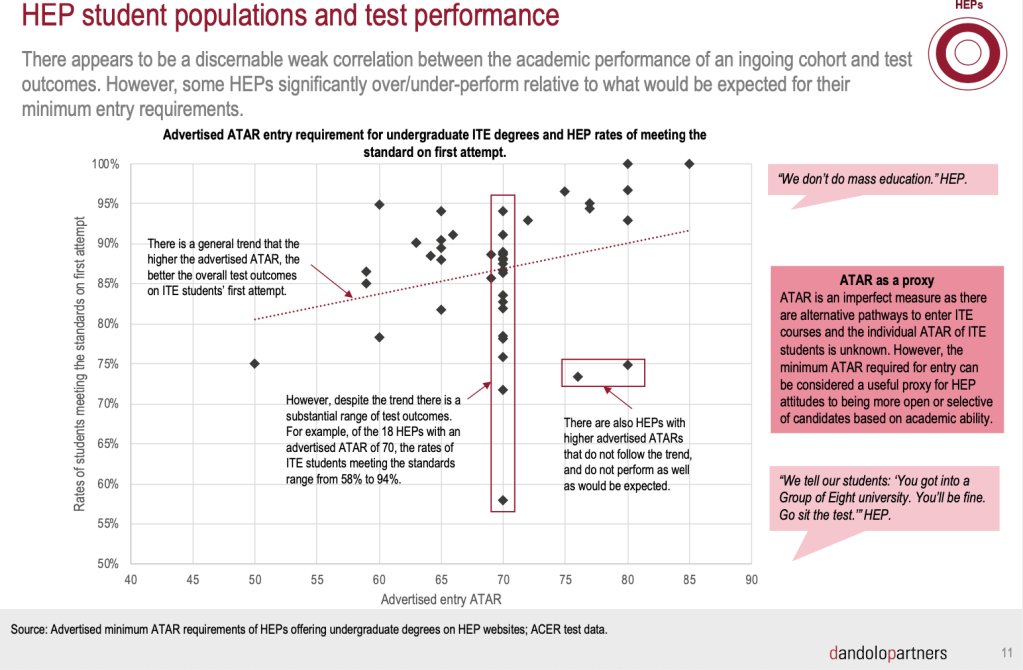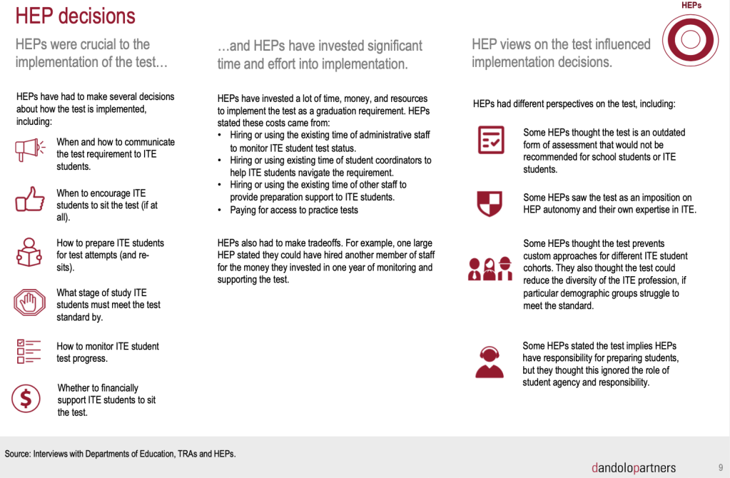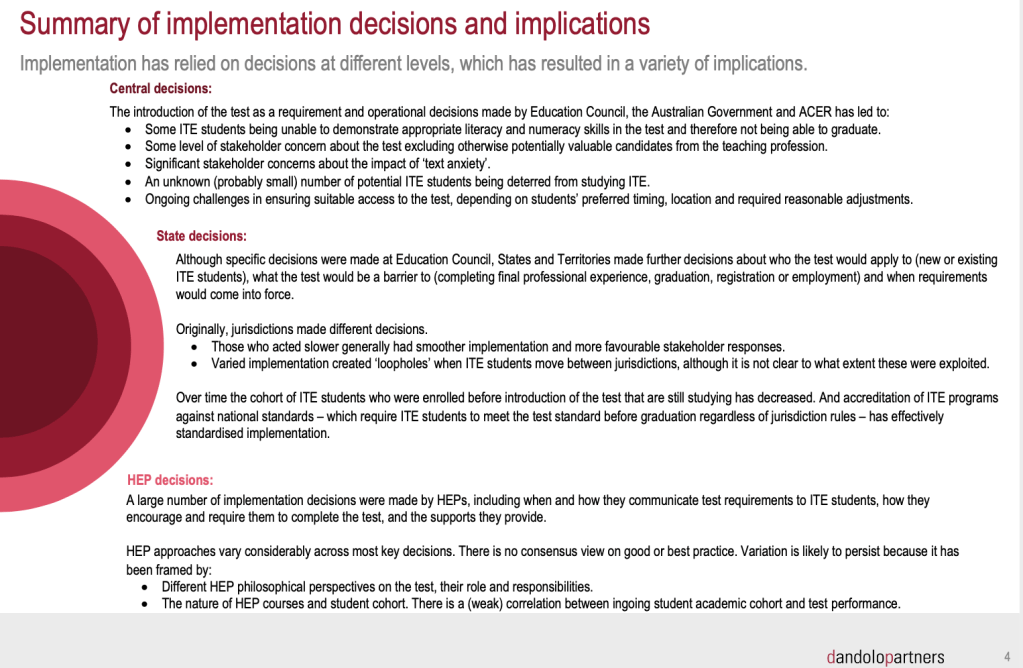 It’s clear that no one – not state governments, Teacher Registration Authorities (TRAs), HEPs or students – have had enough time, information and guidance to make informed and consistent decisions, and this has led to a cascade of negative consequences. This must surely rank as one of the largest and most egregious failures of policy implementation in Australian education history. And it is just utterly shameful that it has taken four years for this analysis to be conducted. We are still waiting for it to properly shared or acted on.