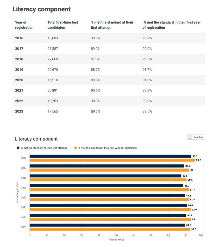 - “Extensive data regarding the number of test candidates who have attempted the LANTITE and the percentage who have met the required standard, broken down by literacy and numeracy components, year and whether candidates met the required standard on their first attempt or in their first year of registration,” available on the department’s website.